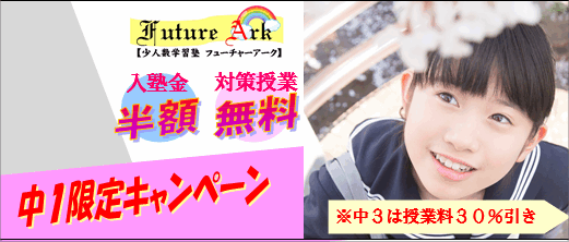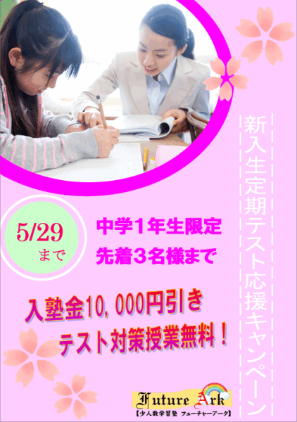 本日、中3生1名のご入塾のお申込みをいただきましたので、「開校1周年記念キャンペーン」はあと2名までとなります。